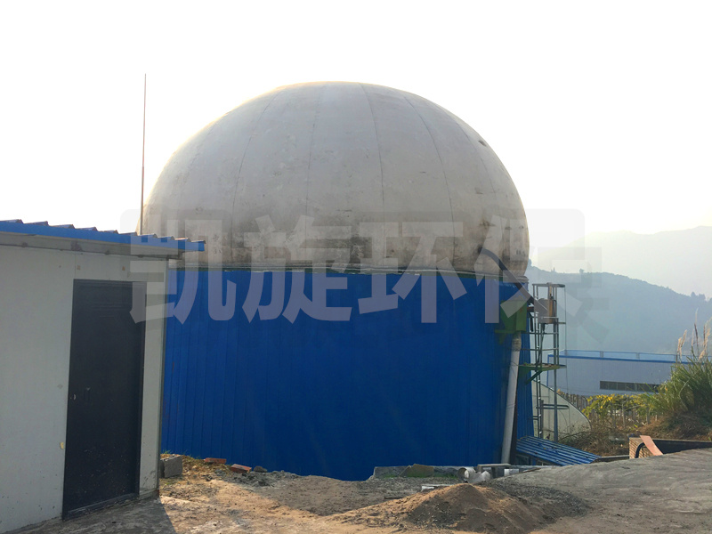 雙層膜沼氣罐外型為3/4球體,由鋼軌固定于水泥基座或厭氧罐罐頂上。主體由特殊加工聚酯材質(zhì)制成,罐體由外膜、內(nèi)膜、底膜(地上柜)及附屬設備組成,具有抗紫外線及種微生物的能力,高度防火并符合標準。